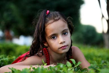 Keywords: girl garden model child family green grass red dress hair beauty childhood face photo little girl pose linda natural small