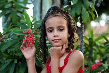 Keywords: girl holding flower girl in the garden model child family green grass red dress garden hair beauty childhood face photo girl little girl pose linda natural small