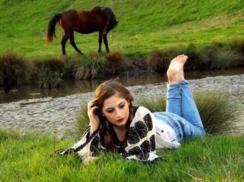 Keywords: girl horse rustic grass lake meadow green traditional
