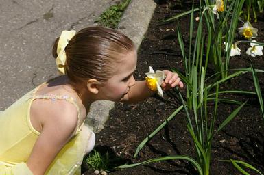 Keywords: girl kid child ballerina daffodil yellow sniffing smelling
