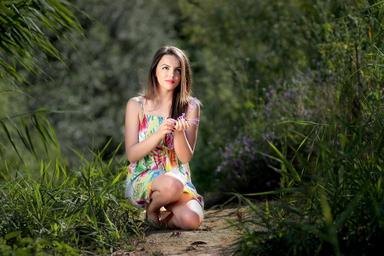 Keywords: girl kneel nature beauty green summer dress