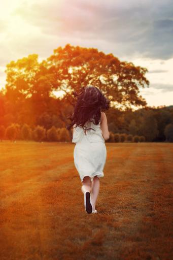 Keywords: girl runner autumn cool back view field freedom lons hair white dress dream