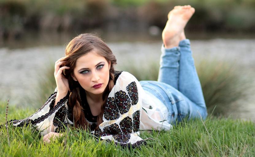 Keywords: girl rustic grass lake meadow green traditional