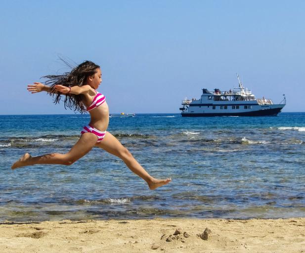 Keywords: girl sea beach summer jumping running fun happy