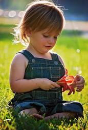 Keywords: girl sitting flower red baby toddler portrait casual outdoor young female cute summer overalls country grass nature