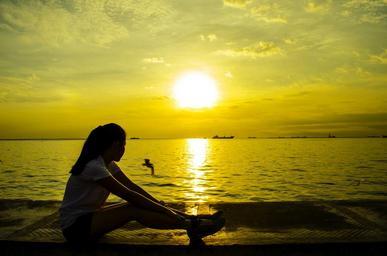 Keywords: girl sitting sunset rest relax enjoy sun sunrise morning silhouette golden early morning water ocean coast shore