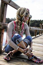 Keywords: girl sitting tailor seat cross-legged portrait pier blond hair braid sandals