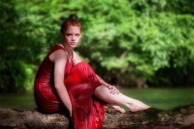Keywords: girl sitting tree water river young female woman portrait cute attractive white teen outdoor summer fashion red dress redhead pose elegant sunny glamour