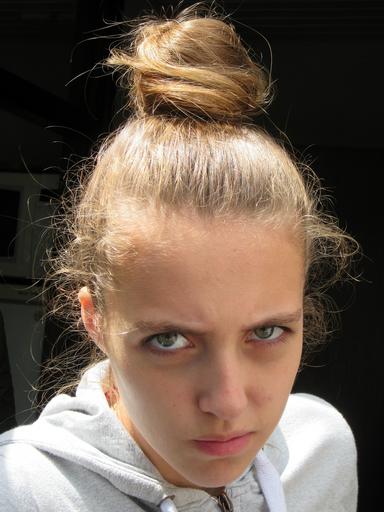Keywords: girl teen face mimicry emotion young blue eyes long hair knot