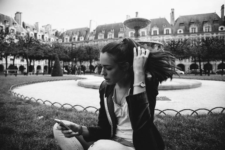 Keywords: girl texting iphone mobile brunette ponytail people fashion sitting fountain courtyard black and white