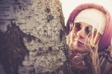 Keywords: girl tree bark hood hat scarf cold sunglasses blonde fashion people nature