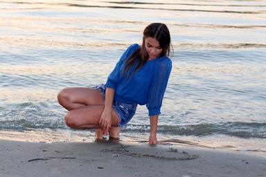 Keywords: girl water heart sand waves beauty sensual in the evening brunette