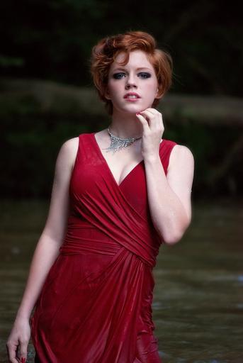 Keywords: girl water teen portrait young female summer nature fashion outdoor redhead beautiful pose red dress style natural hair face