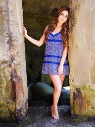 Keywords: girl woman beautiful long hair brown wavy posing skinny fit blue wall dress