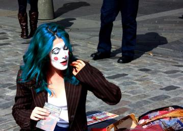 Keywords: girl woman cosmetics street festival entertainer sitting hair blue colorful makeup female young pose