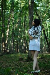 Keywords: girl woman female dress white hat nature young forest black hair model fashion