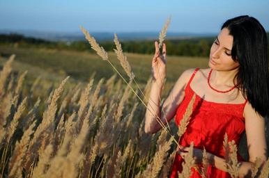 Keywords: girl woman female nature red dress field young lady black hair