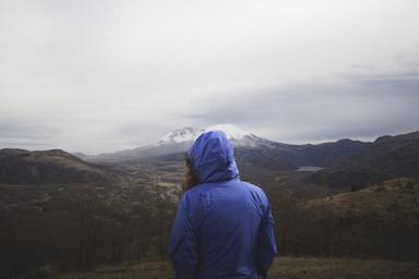 Keywords: girl woman hood jacket landscape nature adventure mountains hills valleys field cloudy clouds sky people