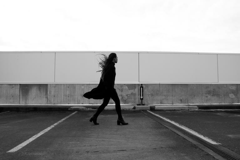 Keywords: girl woman model fashion coat boots heels windy parking lot pavement black and white people