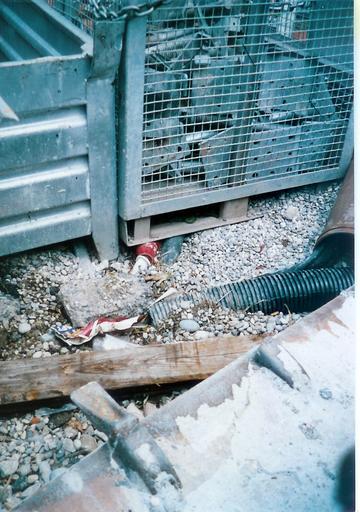 | Keywords: Gitterboxen auf Leitungen.jpg  Betriebsunfall auf einer Baustelle Sicherheitsmangel bei der Installation stromführender Leitungen hier 225 A ” die Isolierung wurde durch das Gewicht der von einem Kran abgelassenen Box beschädigt sodaß der Strom zum Metall der Gitterbox überging Zu diesem Zeitpunkt berührten zwei Bauarbeiter die Box und erlitten daher einen mittelschweren Stromunfall Diese mußten zur stationären Behandlung in ein Krankenhaus eingeliefert werden own 2006-07 User Mattes Electric cables Work accidents Taken with Panasonic Lumix DMC-LC50 Work by Mattes 2006 User Mattes/Contributions/Topics/Technology Lattice boxes |