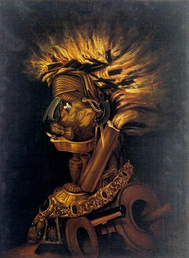 | Keywords: Giuseppe Arcimboldo - Fire - WGA0828.jpg  Artwork Creator Giuseppe Arcimboldo ca 1572 Oil on canvas size cm 75 66 Private collection accession number object history credit line WGA link 828 http //www wga hu/art/a/arcimbol/3allegor/7elem3 jpg http //www wga hu/html/a/arcimbol/3allegor/7elem3 html PD-old-100 painting mythological Italian 1551-1600 The Four Elements Arcimboldo 1566 Allegories of fire 16th-century paintings in unidentified private collections 1560s oil on canvas paintings WGA form painting WGA type mythological WGA School Italian WGA time period 1551-1600 Men facing left in art Fire in paintings Anthropomorphic pareidolias by Giuseppe Arcimboldo 16th-century paintings in private collections |