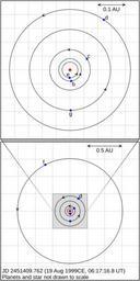 | Keywords: GJ581orbits Vogt2010.svg en <b>Summary</b> SVG image of the Gliese 581 system orbits Plot of the orbits of the Gliese 581 system including the unconfirmed planet g Orbit data taken from Vogt et al 2010 http //arxiv org/abs/1009 5733 The Lick-Carnegie Exoplanet Survey A 3 1 M Š• Planet in the Habitable Zone of the Nearby M3V Star Gliese 581 The configuration is given in Table 2 The 6-planet solution quoted is for circular orbits thus eccentricities are not represented <b>Assumptions </b> It is assumed that the system is coplanar This cannot be constrained by the radial velocity observations used to detect the planets in this system but our solar system's planets are nearly coplanar and both the systems of PSR B1257+12 planets B and C and Epsilon Eridani planet b and the circumstellar disk are coplanar see http //adsabs harvard edu/abs/2003ApJ 591L 147K Konacki and Wolszczan 2003 The Astrophysical Journal 591 L147 “L150 Masses and Orbital Inclinations of Planets in the PSR B1257+12 System and http //adsabs harvard edu/abs/2006AJ 132 2206B Beust et al 2006 The Astrophysical Journal 132 2206 “2218 The Extrasolar Planet É› Eridani b Orbit and Mass respectively so this assumption is at least reasonable The direction of rotation around the star is assumed to be the same for each planet Again this cannot be constrained by the current radial velocity observations but is a reasonable assumption since this is true for the major planets in our own solar system and is predicted by current theories of planet formation Under these first two assumptions the orientation of the orbits relative to each other is correct as depicted in this diagram however their actual orientation in 3D space with respect to external reference points e g the Sun the galactic centre is unknown hence such directions are not indicated on the diagram A further assumption is that the true masses of the planets are small compared to that of the star If the masses were comparable to that of the star the actual semimajor axis corresponding to the measured orbital period would be greater This assumption is supported both by probability the chance that we are observing a system which has sufficiently low inclination for this to be relevant is very low and by dynamical stability arguments which indicate that the planets cannot have true masses much more than 1 6 times their minimum masses Mayor et al 2009 This effect can therefore safely be neglected <b>Interpreting the diagram</b> The planetary orbits are drawn in orthographic projection as viewed from directly above the plane of the system so that the orbital direction is anticlockwise The position of each planet in its orbit is given for the specified epoch given in the Vogt et al 2010 paper While the orbits are drawn to the correct scale the star and the planets themselves are not shown to scale as they would be too small to see on the scale of this diagram In addition the true radii of the planets themselves are currently unknown as no direct observation of the planets has yet been made own Icalanise 2008-10-05 <gallery> File GJ581orbits svg Configuration incorporating only the confirmed planets in the system </gallery> Gliese 581 Exoplanet diagrams Habitable zone |