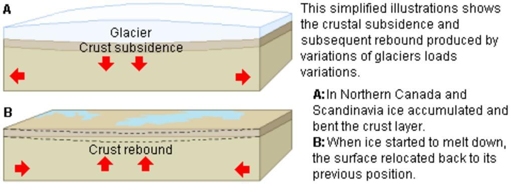 | Keywords: Glacier weight effects LMB.png Description This illustration depicts the stress under which the curst layer undergoes when compressed by the load of a glacier and what happens when the load is released As seen on the below illustration the crust layer bounces back to its previous position This is an automatic process that takes place over a long period of time <b>Image with no caption suitable for other language translations </b> click here <br> Source English Wikipedia original upload 2 August 2005 by Luis María Benítez selfmade Luis María Benítez Diagrams of glaciers Block diagrams cartography Effects Diagrams of isostatic rebound Glacial geomorphology diagrams |
