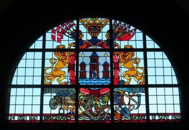 Keywords: Glasmaleri (København Raadhus).JPG Glasmaleri fra København Rådhus København own 2014-02 Orf3us Town hall of Copenhagen - interior Coats of arms of Copenhagen