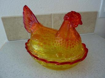 Keywords: glass chicken chicken dish carnival glass food dish mold kitchen collectable decoration dishes design orange colorful display glassware cut glass hen