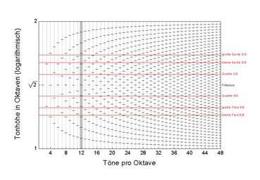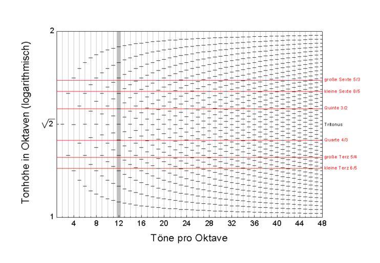 | Keywords: Gleichstufige Aufteilung der Oktave.gif de Im Diagramm sind die Tonhöhen einer gleichstufig aufgeteilten Oktave logarithmisch gegen die Anzahl der Töne pro Oktave dargestellt Die Tonhöhen einer n-stufigen Oktave berechnen sich dabei als Potenzen der n-ten Wurzel aus zwei Die zwölfstufige Aufteilung stellt einen Kompromiss zwischen möglichst geringer Tonanzahl und Nähe zu den reinen konsonanten Intervallen dar Quarte und Quinte werden dabei erstaunlich gut getroffen Terzen und Sexten haben dagegen schon deutlich hörbare Abweichungen Neben den 24- und 36-stufigen Tonleitern die die Töne der 12-stufigen Tonleiter enthalten haben erst die 29-stufigen und 41-stufigen Tonleitern ähnlich reine Quinten und Quarten wobei bei der 41-stufigen Tonleiter auch noch die Terzen und Sexten reiner sind en The graph shows the pitches of a equal tempered octave are shown logarithmically to the number of notes per octave The pitches of a n-stage octave calculated as a magnitude of the n-th root of two 12 equal temperament is a compromise between having the lowest possible number of tones and having close to pure consonant intervals Fourth and fifth are thereby made ‹ ‹surprisingly good thirds and sixths however have clearly audible differences In addition to the 24- and 36-step scales that contain the notes of the 12-step scale only the 29-step and 41-step scales have near perfect fifths and fourths while in the 41-step scale the thirds and sixths are also pure eigenes Werk mit Origin 7 erstellt 2006-07-20 taramensis free File Comparison of equal temperaments png Equal temperaments German text Music diagrams Microtonal music |