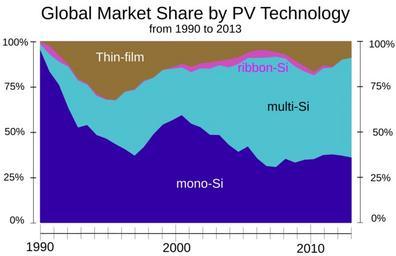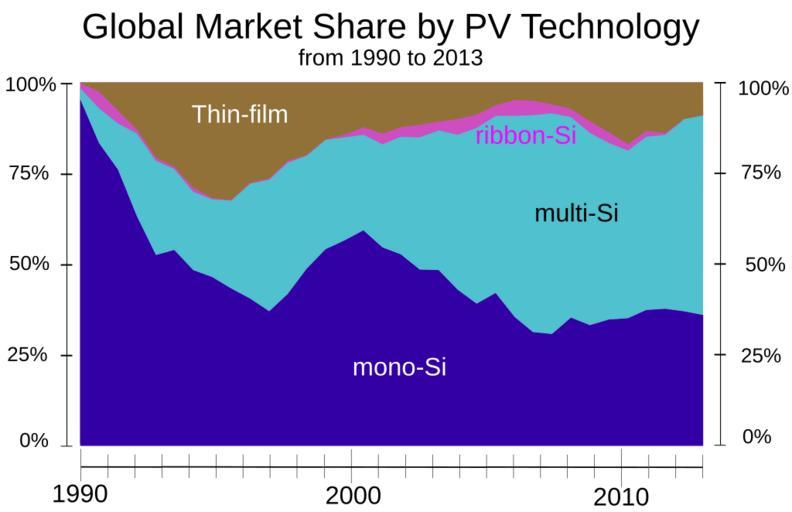 | Keywords: Global Market Share by PV Technology from 1990 to 2013.svg photovoltaic technology from 1990 to 2013 in terms of annual worldwide production Technologies include as follows crystalline silicon c-Si encompassing monocrystalline silicon mono-Si multicrystalline silicon multi-Si and String ribbon ribbon silicon ribbon-Si as well as Thin film solar cell thin-film technology including amorphous silicon Cadmium telluride photovoltaics CdTe and Copper indium gallium selenide solar cells CIGS http //www ise fraunhofer de/en/downloads-englisch/pdf-files-englisch/photovoltaics-report-slides pdf Fraunhofer ISE Report current edition http //www webcitation org/6SFRTUaBS data from archived edition July 28 2014 page 18 2014-09-29 Valid SVG none inkscape margin-top 32px own thumb 220px left PV technology market shares in more detail from 1999 “2010 Photovoltaic power statistics |