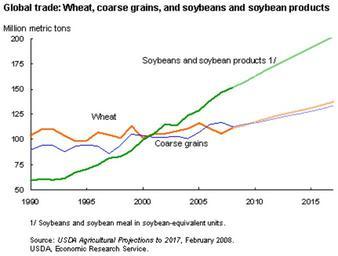 | Keywords: GlobalTrade wheat coarse grain soy 2008 usda.png graph Global trade in soybeans and soybean products has risen rapidly since the early 1990s and has surpassed not only wheat ”the traditional leader in agricultural commodity trade ”but also total coarse grains corn barley sorghum rye oats millet and mixed grains Continued strong growth in global demand for vegetable oil and protein meal particularly in China is expected to maintain soybean and soybean-product trade well above wheat and coarse grains trade throughout the next decade Wheat coarse grains and oilseeds including soybeans compete with each other and with other crops for limited cropland Higher prices for vegetable oils partially the result of increased demand for biodiesel are bringing previously uncropped land in Brazil and Indonesia into soybean and palm oil production http //www ers usda gov/briefing/Baseline/gallery/gallery2008/GlobalTrade gif 2008 Economic research unit of the USDA us federal gov pd-us gov Updated version 2008-04-08 convert to PNG fade projections on graph PD-USGov Macroeconomics Economy of Africa Peak oil International economics Riots Famines Economy of Asia 2008 diagrams Market diagrams 2000s |