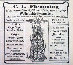 | Keywords: Globensteiner Pyramiden 1.jpg de Die Globensteiner Pyramide ist eine Besonderheit Im Erzgebirge entstanden Pyramiden meistens als Einzelstücke die geschickte Männer neben ihrem Beruf konstruierten und bauten eher als Freizeitbeschäftigung oder um etwas hinzu zu verdienen Die Firma Carl Ludwig Flemming in Globenstein bei Schwarzenberg stellte Produkte wie Handwagen und Kleinmöbel her Um 1900 entwickelte sie ein Pyramidensystem für das sie kleine Holzreste aus der Hauptproduktion verwenden konnte Die Konstruktion erlaubte daß Pyramiden unterschiedlicher Höhe angeboten die Flügel seitlich in die Böden gesteckt und die Kerzenhalter hochgeklappt werden konnten Für ihr Serienprodukt das es mit und ohne Figuren gab warb sie in vielen Zeitungen Sie verschickte ihre Pyramiden in pyramidenförmigen Kartons mit der Post in guten Zeiten über 5000 Stück im Jahr Mit und ohne Geläut mit und ohne Figuren - ganz nach Bestellung Die Figuren können nach Belieben auf die Teller gestellt werden - Anzeige im Schönheider Wochenblatt im Dezember 1904 own Klaaschwotzer 2013-12-02 Historical documents of Schönheide Ore Mountain folk art Breitenbrunn/Erzgeb Globensteiner Weihnachtspyramide Schönheider Wochenblatt Cc-zero |