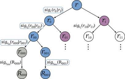 | Keywords: GMR references 2.svg en GMR signature system authentication tree/references tree with root referece r and signature chain; blue references needed to verify the second message; purple references needed to verify the signatures within the reference tree framed with blue ; gray references already used de GMR-Signatursystem Referenzbaum mit Wurzelreferenz r und Signaturkette; Blau Referenzen welche für die Verifizierung der zweiten Nachricht benötigt werden; Purpur Referenzen welche benötigt werden um die blau umrahmten Signaturen im Referenzbaum zu prüfen; Grau bereits bentzte Referenzen own Bananenfalter 2010-08-11 Cryptography diagrams |