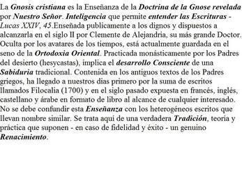 | Keywords: Gnosis cristiana.jpg es La Gnosis cristiana es la Enseñanza de la Doctrina de la Gnose revelada por Nuestro Señor Inteligencia que permite entender las Escrituras - Lucas XXIV 45 Enseñada publicamente a los dignos y dispuestos a alcanzarla en el siglo II por Clemente de Alejandria su más grande Doctor Oculta por los avatares de los tiempos está actualmente guardada en el seno de la Ortodoxia Oriental Practicada monásticamente por los Padres del desierto hesycastas implica el desarrollo Consciente de una Sabiduria tradicional Contenida en los antiguos textos de los Padres griegos ha llegado a nuestros dias primero por la suma de escritos llamados Filocalia 1700 y en el siglo pasado expuesta en francés inglés castellano y árabe en formato de libro al alcance de cualquier interesado No se debe confundir esta Enseñanza con los heterogéneos escritos que llevan nombre similar Se trata aquí de una verdadera Tradición teoría y práctica que suponen - en caso de fidelidad y éxito - un genuino Renacimiento own Oswaldo37 2010-01-31 Christianity |