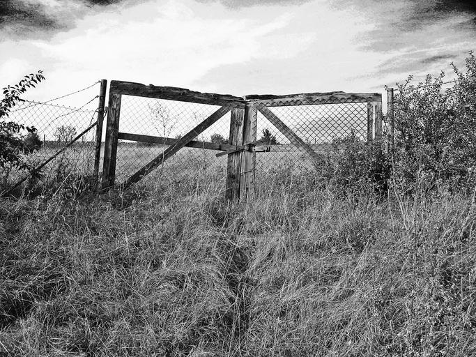 Keywords: goal fence input metal gate wooden boards access meadow black white old past wire mesh fence barbed wire morsch weathered decay padlock stainless rusty