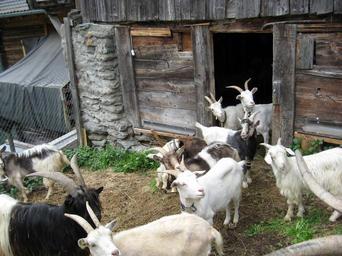 Keywords: goats many white black nature wood hut chill out switzerland alpine mountains pasture log cabin alp trees meadow stall barn simmental mountain hut plank old decay weathered grass sky roof wooden roof stones alm home