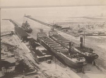 | Keywords: harbours railroads ships monochrome outdoor Photographer: Reuben R. Sallows (1855 - 1937) Description: Winter Picture of Goderich harbour with three ships in port; two larger ships in foreground are side by side; buildings and railroads on left; frozen lake in background; title in pencil and Sallows stamp in blue ink on back; date (January 14, 1924) in pencil. Object ID : 0423-rrs-ogohc-ph View additional photographs by Sallows that are held in other collections at the Reuben R. Sallows Digital Library. Order a higher-quality version of this item by contacting the Huron County Museum (fee applies). Photographer: Reuben R. Sallows (1855 - 1937) Description: Winter Picture of Goderich harbour with three ships in port; two larger ships in foreground are side by side; buildings and railroads on left; frozen lake in background; title in pencil and Sallows stamp in blue ink on back; date (January 14, 1924) in pencil. Object ID : 0423-rrs-ogohc-ph View additional photographs by Sallows that are held in other collections at the Reuben R. Sallows Digital Library. Order a higher-quality version of this item by contacting the Huron County Museum (fee applies). |