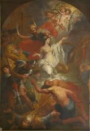 | Keywords: Godfried Maes - The beheading of Saint Dymphna.jpg Artwork Creator Godfried Maes en The beheading of Saint Dymphna 1688 http //balat kikirpa be/photo php path X001222 objnr 71495 nr 12 Oil canvas size cm 337 225 5 Saint Dymphna Church Geel object history credit line signed painted bottom right G MAES INV ET FECIT date painted bottom right 1688 accession number PD-old-100 Works by Godfried Maes Flemish Baroque paintings in the Royal Museum of Fine Arts Antwerp 17th-century oil on canvas paintings Paintings of Saint Dymphna |