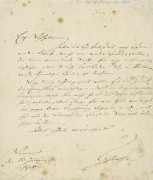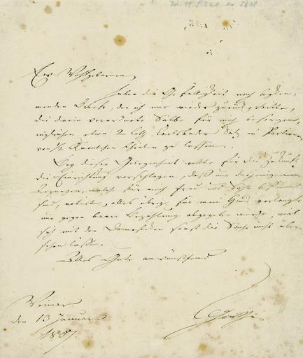 | Keywords: Goethe Brief 1807-01-13 an Carl August Hofmann.jpg Brief Johann Wolfgang von Goethes mit Unterschrift Goethe Weimar 13 Januar 1807 an den Weimarer Hofapotheker Professor Carl August Hofmann; mit der Bitte nach beykommenden Briefe den ich mir wieder zurück erbitte die darin verordnete Salbe für mich besorgen ingleichen etwa 2 Loth Carlsbader Salz in Portionen von ½ Quentchen theilen zu lassen - Bey dieser Gelegenheit wollte für die Zukunft die Einrichtung vorschlagen daß nur diejenigen Arzneyen welche für mich Frau und Sohn bestimmt sind notirt alles übrige für mein Haus verlangte nur gegen baare Bezahlung abgegeben würde weil sich mit den Domestiken sonst die Sache nicht übersehen läßt Sophien-Ausgabe Nr 5308 Aus der Sammlung Hirzel http //www bassenge com Bassenge 1807-01-13 Creator Johann Wolfgang von Goethe PD-old-100 Images from Galerie Bassenge 1807 letters Autographs of Johann Wolfgang von Goethe |