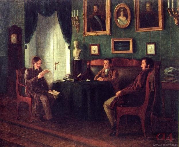| Keywords: Gogol and Zhukovsky at Pushkin's in Tsarskoe selo by P. Geller (1910).jpg Гоголь и Жуковский у Пушкина в Ца ском Селе Художник П Гелле 1910 http //www a4format ru/photo open php file 494a7e13 jpg 1910 П Гелле PD-Art Petr Geller Files uploaded by Shakko from various sources Aleksandr Pushkin in art Vasily Zhukovsky Nikolai Gogol in art | ||||
