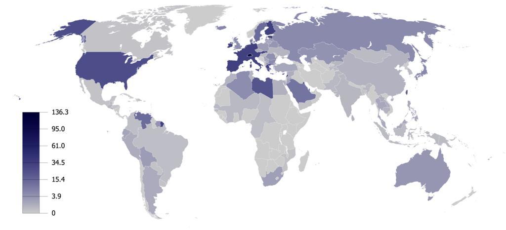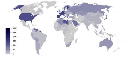 | Keywords: Gold Reserves.png en Gold reserves per capita http //www research gold org/reserve_asset/ World Gold Council Emilfaro en 2011-01-31 GunnMap wikitable center style background f0f0f0; Area center style background f0f0f0; Population center style background f0f0f0; Gold reserves in tonnes center style background f0f0f0; Gram per capita - Switzerland 7 633 271 1 040 1 136 3 - Lebanon 4 140 243 286 8 69 3 - Netherlands Antilles 229 645 13 1 57 0 - Eurozone 322 669 491 10 792 5 33 4 - Aruba 105 484 3 1 29 4 - Kuwait 2 846 367 79 0 27 8 - Singapore 4 724 773 127 4 27 0 - United States of America 311 997 196 8 133 5 26 1 - Libya 6 541 767 143 8 22 0 - Taiwan 23 053 305 423 6 18 4 - Qatar 845 215 12 4 14 7 - Sweden 9 082 567 125 7 13 8 - Venezuela 27 465 835 365 8 13 3 - Denmark 5 524 306 66 5 12 0 - Saudi Arabia 29 506 952 322 9 10 9 - Iceland 310 178 2 0 6 4 - Bahrain 743 369 4 7 6 3 - Japan 126 626 004 765 2 6 0 - Russia 139 006 099 784 1 5 6 - Bulgaria 7 116 512 39 9 5 6 - United Kingdom 61 385 414 310 3 5 1 - Algeria 34 825 464 173 6 5 0 - Romania 22 160 479 103 7 4 7 - World 6 875 841 027 30 546 1 4 4 - Kazakhstan 15 496 742 67 3 4 3 - Suriname 489 785 2 0 4 1 - Australia 21 663 346 79 9 3 7 - Belarus 9 591 779 35 3 3 7 - Latvia 2 210 167 7 7 3 5 - Macedonia 2 075 245 6 8 3 3 - Mauritius 1 299 795 3 9 3 0 - Bolivia 10 047 732 28 3 2 8 - Poland 38 452 413 102 9 2 7 - South Africa 49 094 711 124 9 2 5 - Jordan 6 488 225 12 8 2 0 - Serbia 7 324 607 13 1 1 8 - Ecuador 14 918 083 26 3 1 8 - Lithuania 3 539 499 5 8 1 6 - Philippines 101 030 609 156 5 1 5 - Trinidad and Tobago 1 228 043 1 9 1 5 - Thailand 66 638 287 99 5 1 5 - Turkey 78 383 454 116 1 1 5 - Malaysia 26 420 998 36 4 1 4 - Argentina 41 595 293 54 7 1 3 - Czech Republic 10 195 128 12 7 1 2 - Laos 7 087 667 8 8 1 2 - El Salvador 6 063 774 7 3 1 2 - Peru 30 115 664 34 7 1 2 - Syria 22 451 898 25 8 1 1 - Egypt 81 415 484 75 6 0 9 - Cambodia 14 907 288 12 4 0 8 - Sri Lanka 21 622 468 17 5 0 8 - China 1 333 962 627 1 054 1 0 8 - Morocco 31 827 695 22 0 0 7 - Tunisia 10 649 246 6 8 0 6 - Ukraine 45 250 507 27 5 0 6 - Guatemala 13 710 922 6 9 0 5 - India 1 182 599 587 557 7 0 5 - Kyrgyzstan 5 554 165 2 6 0 5 - Tajikistan 7 568 703 3 3 0 4 - Albania 3 671 632 1 6 0 4 - WAEMU 99485261 36 5 0 4 - Pakistan 178 846 050 64 4 0 4 - Papua New Guinea 6 136 694 2 0 0 3 - Hungary 9 864 998 3 1 0 3 - Indonesia 244 535 321 73 1 0 3 - Korea South 48 710 208 14 4 0 3 - China Hong Kong SAR 7 109 657 2 1 0 3 - Mongolia 3 114 066 0 9 0 3 - CEMAC 319 470 944 102 7 0 3 - Fiji 965 473 0 2 0 2 - Brazil 202 482 844 33 6 0 2 - Colombia 44 511 121 6 9 0 2 - Paraguay 6 424 800 0 7 0 1 - Mozambique 22 294 275 2 3 0 1 - Canada 33 918 089 3 4 0 1 - Honduras 8 080 289 0 7 0 1 - Uruguay 3 519 648 0 3 0 1 - Bangladesh 159 242 804 13 5 0 1 - Yemen 23 868 673 1 6 0 1 - Mexico 113 207 390 7 3 0 1 - Dominican Republic 9 879 476 0 6 0 1 - Malawi 15 697 470 0 4 0 0 - Costa Rica 4 551 966 0 1 0 0 - Chile 16 830 930 0 2 0 0 - Burundi 10 068 983 0 0 0 0 - Comoros 785 786 0 0 0 0 - Haiti 9 302 365 0 0 0 0 - Kenya 40 654 681 0 0 0 0 - Oman 3 002 517 0 0 0 0 - Maps of the world indicating regions Gold maps Economy of Iceland Gold reserves |