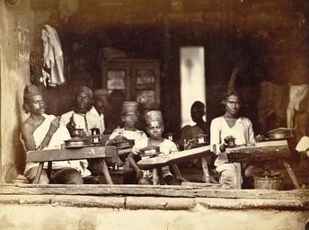| Keywords: Gold and silver wire and thread drawers at work - 1873.jpg en The tinsel wires are made of silver or silver coated with gold leaf and made into a bar which is then forced through a series of holes on a steel plate to obtain increasingly fine-gauged lengths Traditionally the wire was then wound onto a reel as seen in the photograph attached at the other end to a jantar another steel plate which allowed for further refining of the gauge Wires no thicker than a hair were obtained this way A tola 180 grains of metal usually produced 600 to 1 200 yards of wire This product is used sometimes together with silk in a wide range of articles and garments Examples of all the following were sent to the Vienna exhibition turbans saris dresses shoes fringing gold and silver lace shawls rugs and tablecloths It was held that metal threads from India were less likely to tarnish than similar products from other sources 1873 http //www oldindianphotos in/2011_08_16_archive html Shivashanker Narayen other versions Custom license marker 2015 03 25 PD-100 Uploaded with UploadWizard Uncategorized 2015 March 25 |