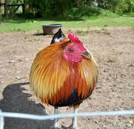 Keywords: golden cockerel fowl male bird domesticated farm feeding pen soil close-up ground level