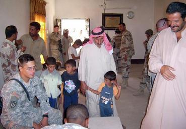 | Keywords: Golden Dragons Care for Citizens DVIDS53963.jpg en Cpl Andrew Pruneda a medic with the 2nd Battalion 14th Infantry Regiment 2nd Brigade Combat Team 10th Mountain Division Light Infantry out of Fort Drum N Y takes a break during a combined medical operation in al-Blasem Iraq Aug 14 2007-08-14 Christina McCann https //www dvidshub net/image/53963 53963 2007-08-17 08 36 AL-BLASEM PD-USGov Fort Drum Images from DoD uploaded by Fæ | ||||