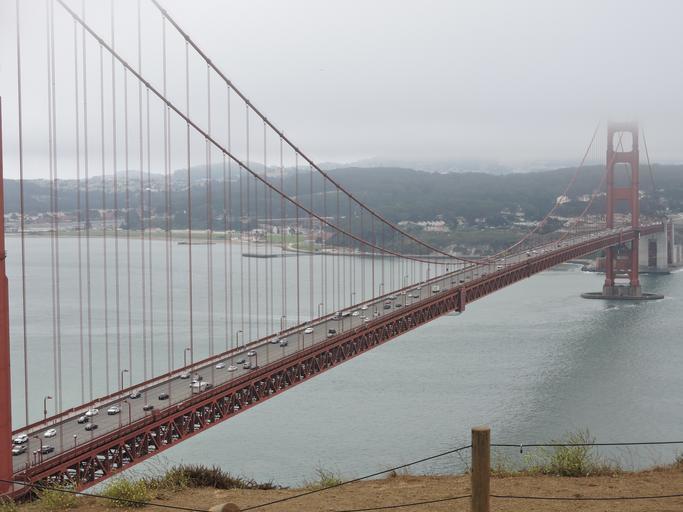 Keywords: golden gate bridge bridge suspension bridge san francisco water california bay landmark pacific travel tourism red city usa famous structure america foggy fog smog cars