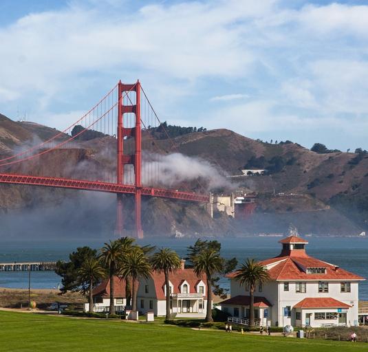 Keywords: golden gate bridge fog san francisco california historic landmark travel architecture famous red metal suspension cable attraction ocean waterfront pacific usa buildings clouds water sea skyline scenic