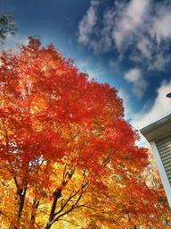 Keywords: golden orange trees foliage leaves leafy branches blue sky white clouds cloudy buildings urban city bright sunny day autumn fall seasons