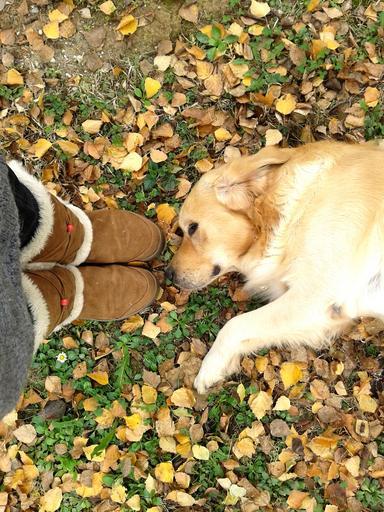 Keywords: golden retriever autumn leaves dog golden pet retriever animal cute happy canine friend light outdoor yellow nature young portrait happiness park sun day white fall bright color play boots indian shoes standing