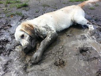 Keywords: golden retriever plays purebred dog meadow kennels spout dog mud